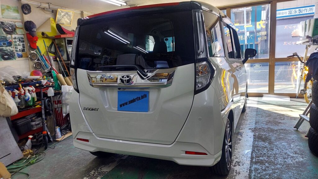 トヨタ ルーミーにスーパー断熱フィルム 2025年11月17日 最終更新日時 : 2025年11月17日 admin トヨタ ルーミー入庫です。 お客さんと打合せパッと見外から真っ黒に見えるようにとのリクエストでしたのでリアガラス一式にSC7015で施行させていただきました。