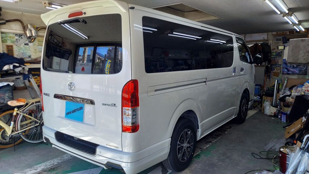 ハイエースにスーパー断熱フィルム 2026年3月10日 最終更新日時 : 2026年3月10日 admin ハイエース入庫です。 お客さんと打合せリアガラス一式にスモークスーパー断熱フィルム施行させていただきました。