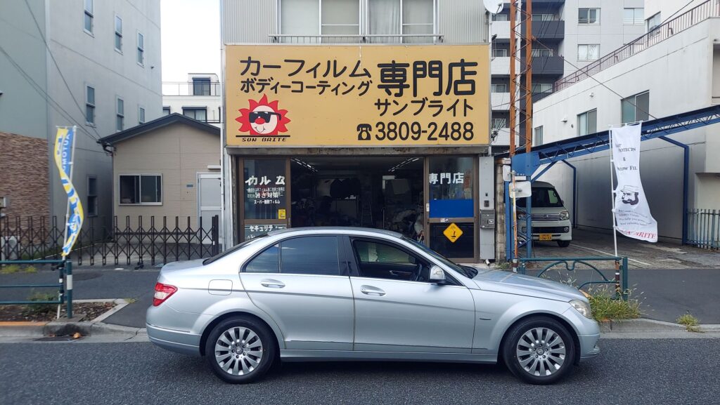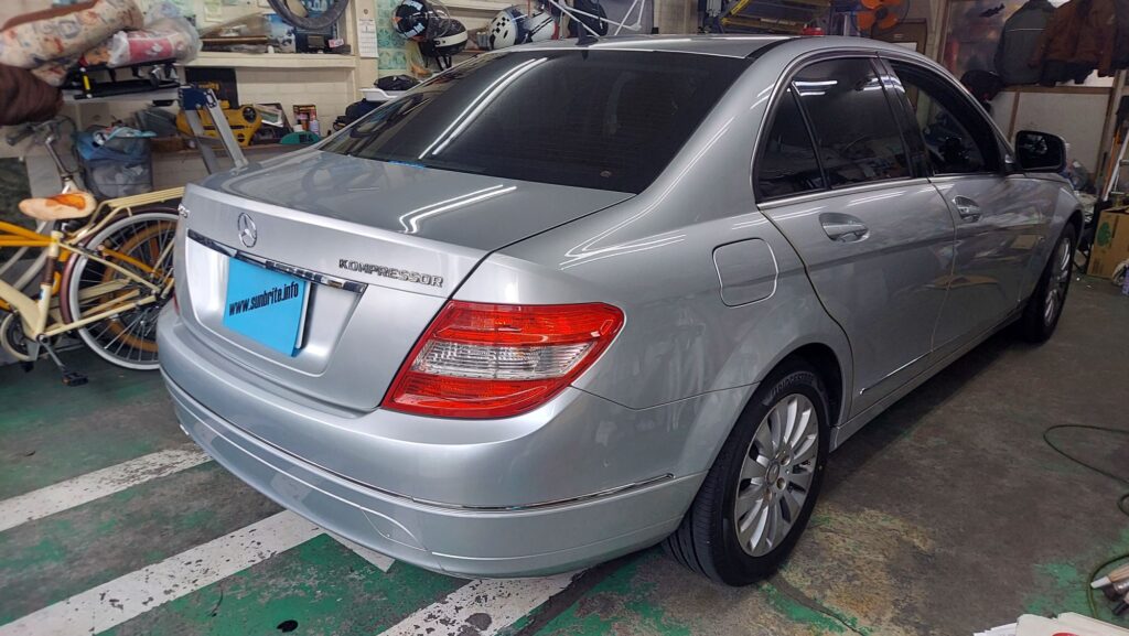 ベンツC200にスーパー断熱フィルム 2025年9月13日 最終更新日時 : 2025年9月13日 admin ベンツC200入庫です。 お客さんと、打合せリアガラス一式にスモークスーパー断熱フィルム施行させていただきました。