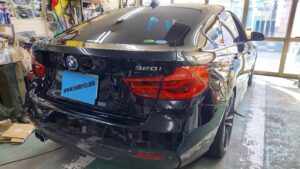BMW320iGT入庫です。 お客さんと打合せリアガラス一式にスモークスーパー断熱フィルム施行させていただきました。