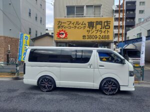ハイエース入庫です。 色無しガラスにスモークスーパー断熱フィルム施工させていただきました。 外から真っ黒中からすっきり仕上げました。(フラッシュで写り悪かったです)