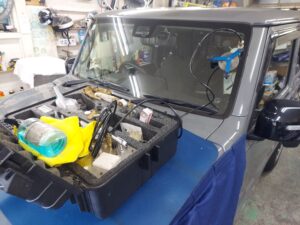 スズキジムニーNOMAD入庫です。 お客さんと打合せフロントガラスにステルスヴィジョン、リアガラス一式スモークスーパー断熱フィルム、運転席、助手席に透明スーパー断熱フィルム、ボディは、GFMX コーティング施工させていた […]