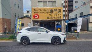 レクサスNX入庫です。 お客さんと打合せリアガラス一式にスモークスーパー断熱フィルム、運転席、助手席に透明スーパー断熱フィルム施行させていただきました。
