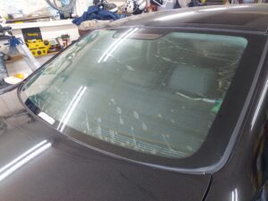 E50 BMW320i入庫です。 お客さんと打合せリアガラスフィルム経年劣化でフィルム剥離させていただきました。